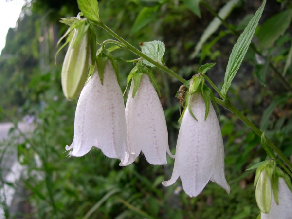 初夏、国道168号線を十津川に向けて車を走らせると、道路際に白い花をつけたホタルブクロが並ぶようになる。全線アスファルト舗装されているが、道路脇に貯まった薄っぺらい土砂を床にしながらしたたかに生きている。この生命力は強靱で、以前、わが家の庭に一株移植すると、地下茎が伸びだし一直線上に等間隔で芽を出し始めた。
