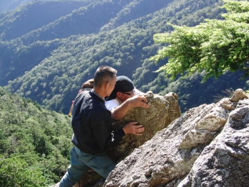 【再生の旅・裏行】 表行が「死に行く旅」に対して、裏行は「再生の旅」と言われている。大峯山寺本堂裏手が裏の行場となっているが、先達の案内なしでの立ち入りが禁止されている。登山客であっても、それぞれの宿坊に頼めば、有料で体験できる。 喜蔵院宿坊の左手を進んでいくと裏行場の入り口となる。「不動登り岩」「押し分け岩」「護摩の窟」「胎内くぐり」「屏風岩」「賽の河原」…「東の覗き」「蟻の戸渡り」「平等岩」といった名前の行場が続く。この中に、表行の西の覗きに対して、「東の覗き」というのがあるが、極めて危険なため現在は中止となっている。しかし、西の覗に匹敵する恐怖心を試されるのが「平等岩」である。三角錐状の岩を両手でしがみつきながら、断崖絶壁をくるっと回ってくる行であるが、自分の腕だけが命綱という荒行である。平等岩での行を終えるとやや放心状態、あるいはちょっとしたクライマーズ・ハイだろうか。行場から解き放たれ、軽くなった足取りで、大峯山寺本堂脇に出てくる。講での団体行動なら、ここで般若心経を唱えて行の終了ということになる。