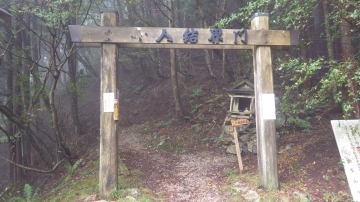 【五番関から洞辻茶屋へ】 洞川毛又大橋よりより林道高原洞川線を上っていくと、五番関トンネルの西側に登山口があり駐車スペースもある。ここから約15分の急登で五番関に到着。吉野山から大峯奥駈道を逆峰してくると、1970年(昭和45) までは、吉野山奥千本に近い青根ヶ峰付近から女人結界だったが、現在は、ここ五番関に女人結界門が設けられている。 途中、鍋を被った行者尊が祀られお堂が建っている。その昔、大峰山中で修行をしていた役行者を、大蛇が口から火を噴いて修行の邪魔をしていたので、行者は鍋を被ってその難を退けたという故事にまつわるものらしい。いずれにしても珍しい行者像である。さらに進むと今宿跡と表示された明るい林に出るが、行場らしき石積みと残された碑伝が目に入るくらいが痕跡である。ここから尾根伝いに1時間弱で洞辻茶屋に到着、清浄大橋からの参詣道と合流する。 ここは大峯奥駈68番の靡「浄心門」である。