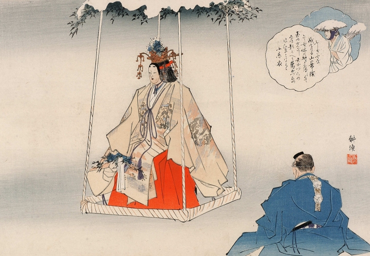 雄略天皇、葛城山で一言主の神に遭遇し、敬意を払う。 |